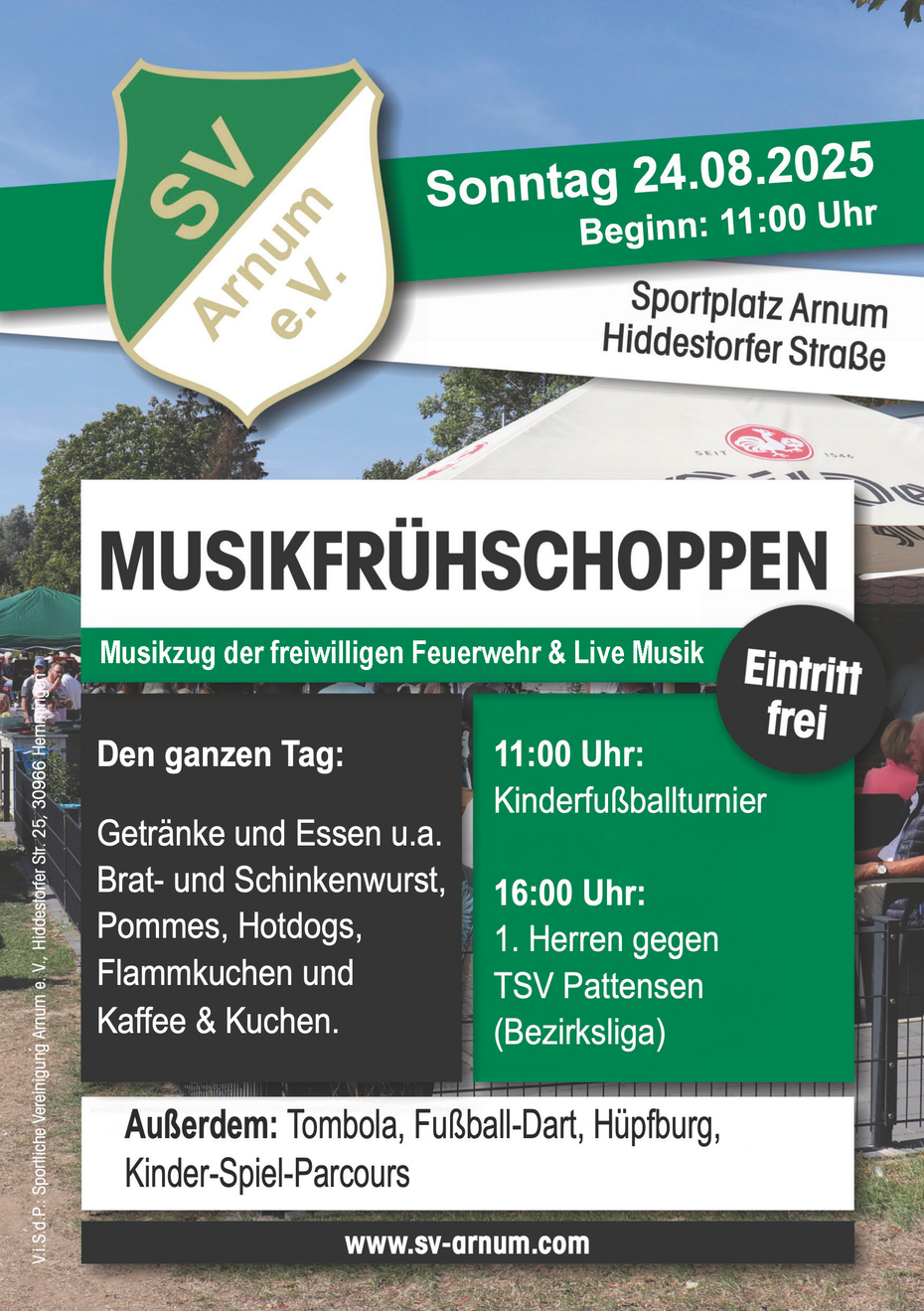Der Eintritt ist frei! Für die musikalische Unterhaltung sorgt DJ Gerd. 11:00 Uhr: offizieller Beginn des Musikfrühschoppens U11 Fußball Jugendturnier 15:00 Uhr: 1. Herren Fußball: SV Arnum gegen Niedersachsen Döhren Den ganzen Tag: Für das leibliche Wohl wird am Foodtruck u. a. mit vegetarischem Essen gesorgt, es gibt Getränke, Bratwurst, Schinkenwurst und Pommes sowie Kaffee und Kuchen. Außerdem: Torwandschießen, Kinder-Spiele-Parcours Wir bitten darum, die zum Zeitpunkt der...