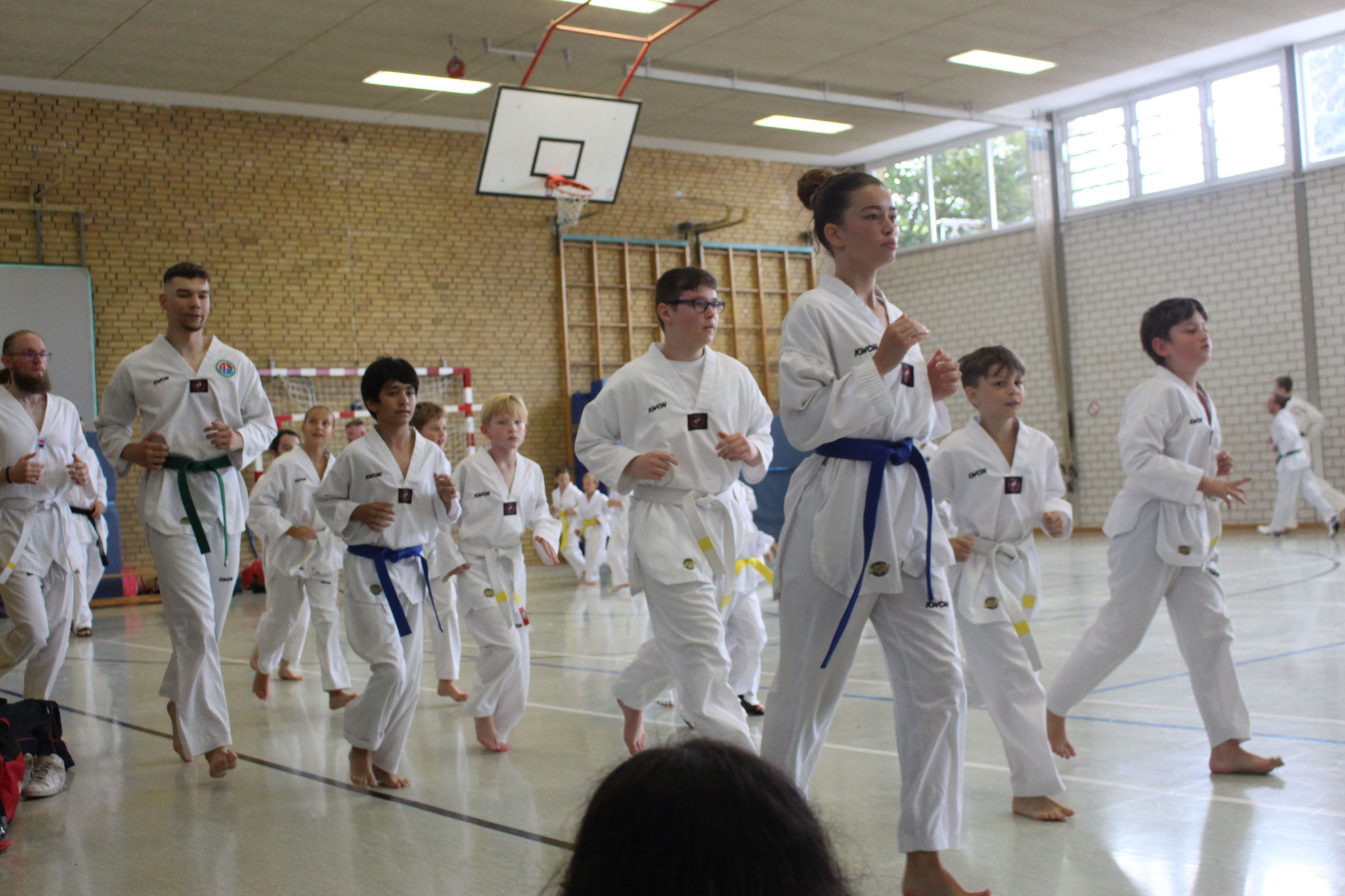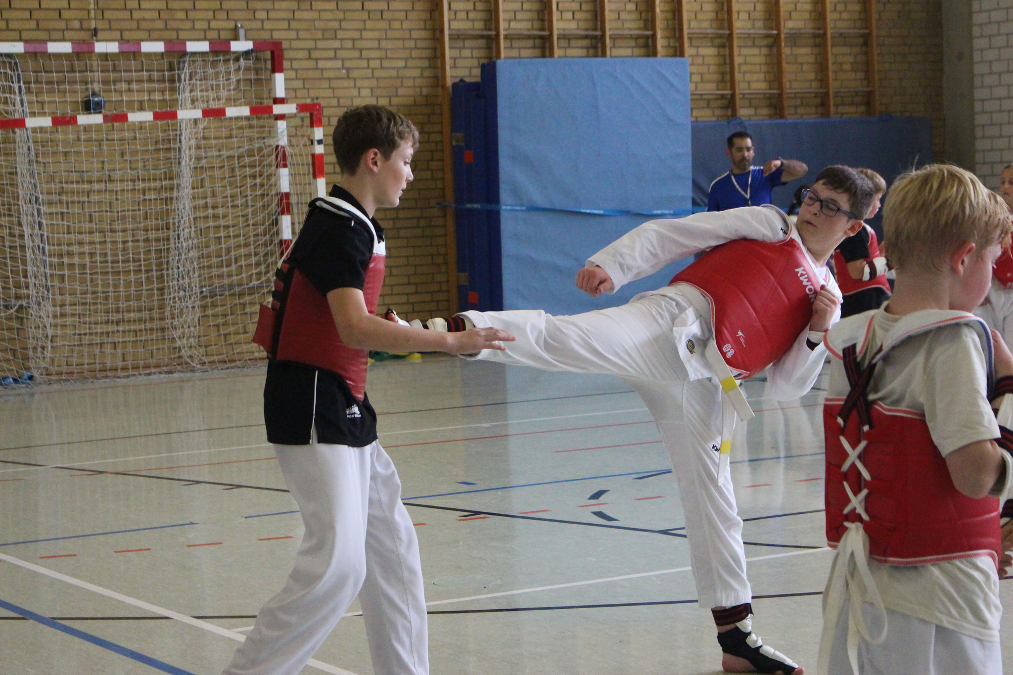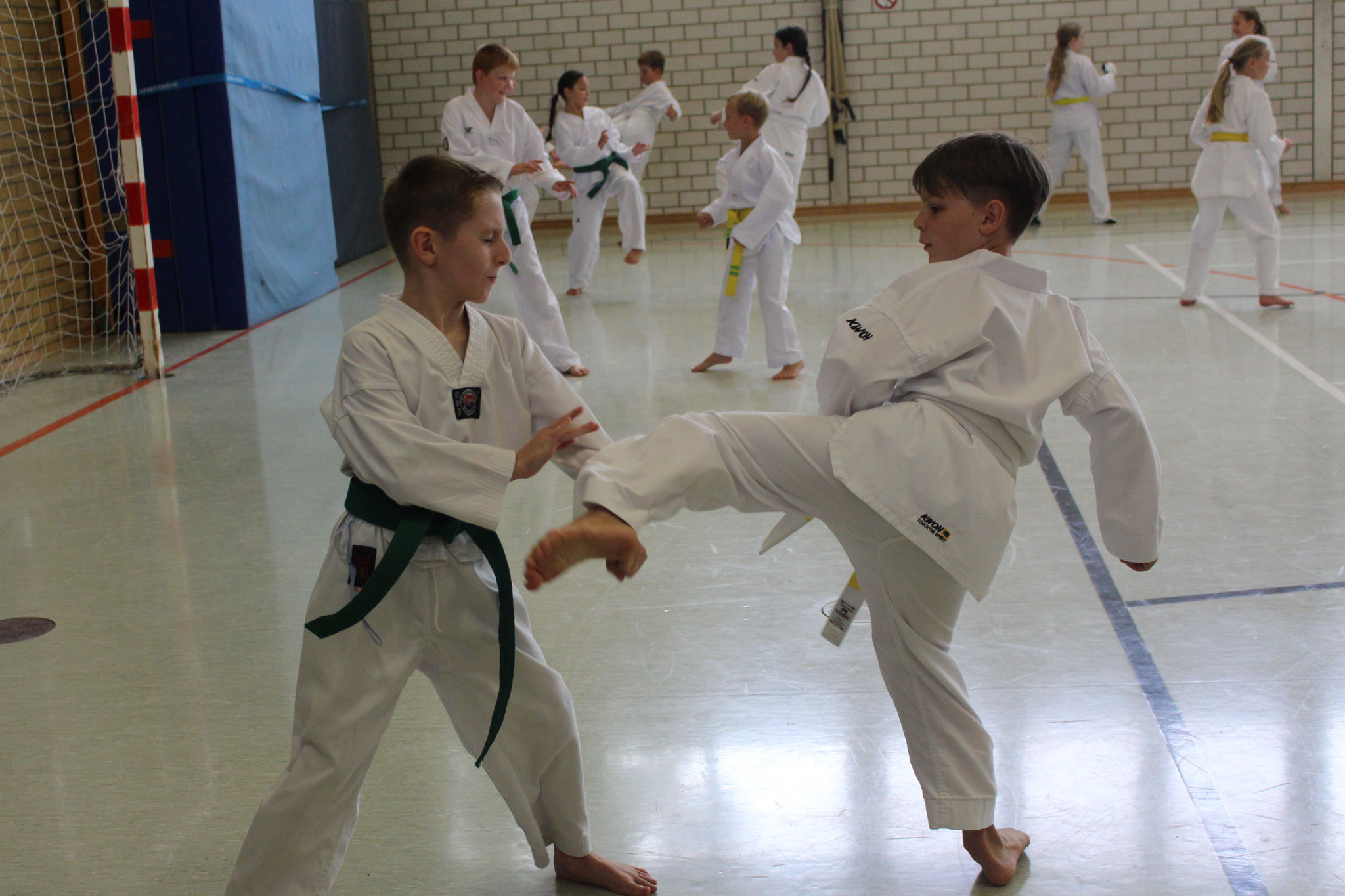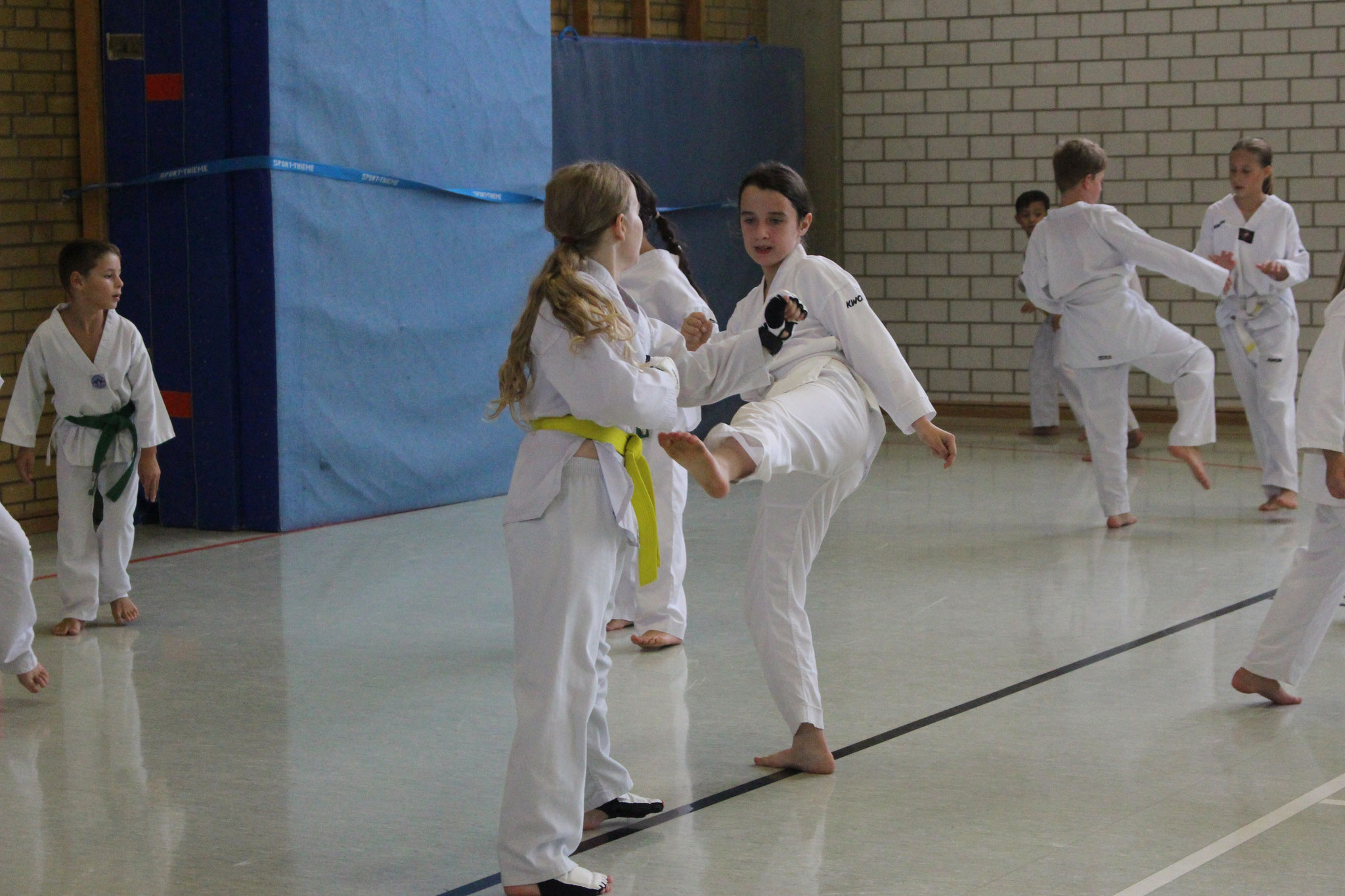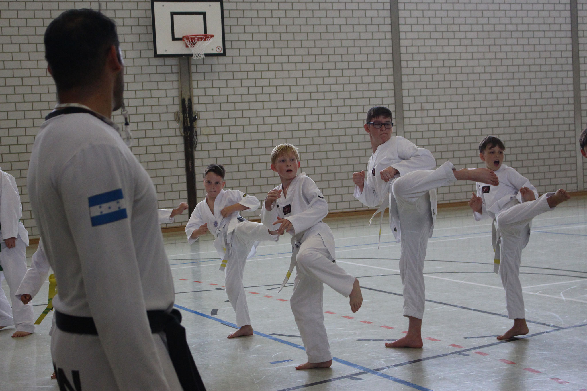 Zum Ende des Schuljahres war es dann auch für unsere vier Anfänger Matilda, Henri, Delian und Tamino soweit. Sie legten ihre erste Prüfung überhaupt, ebenfalls bei Prüfer Wolfgang Falke, jedoch auf heimischer Fläche in Arnum ab. Der kleine Turbokurs, der die Prüfungsinhalte von sonst neun Monaten in nur sechs Monaten erarbeitet hatte, konnte den Prüfern in allen Fächern (Grundtechnik, Pratzentechniken (Pratzen-Sparring), Step-Sparring, Kampf-Il-Bo-Taeryon und Theorie überzeugen. Natürlich gibt es wie immer noch Details zu bearbeiten, worauf Falke detailliert hinwies. Die beste Prüfungsleistung insgesamt lieferte Matilda ab, die sich trotz einer schmerzhaften Fußverletzung nichts anmerken ließ und eine fehlerfreie Bestleistung präsentierte. Theorie war von allen sehr gut gelernt, denn niemand blieb eine korrekte Antwort schuldig.