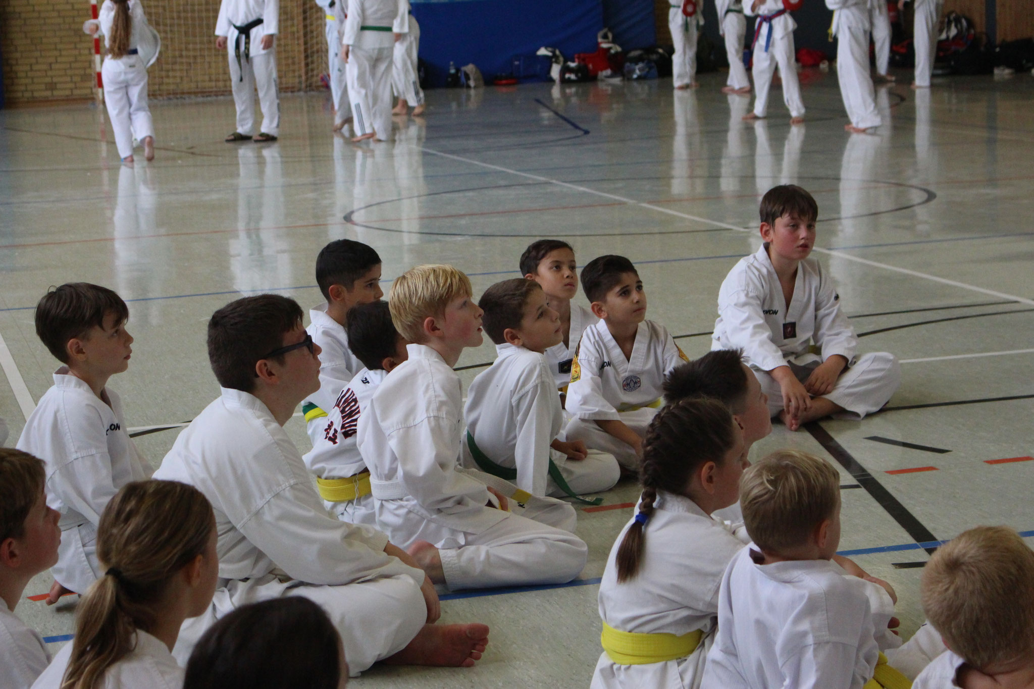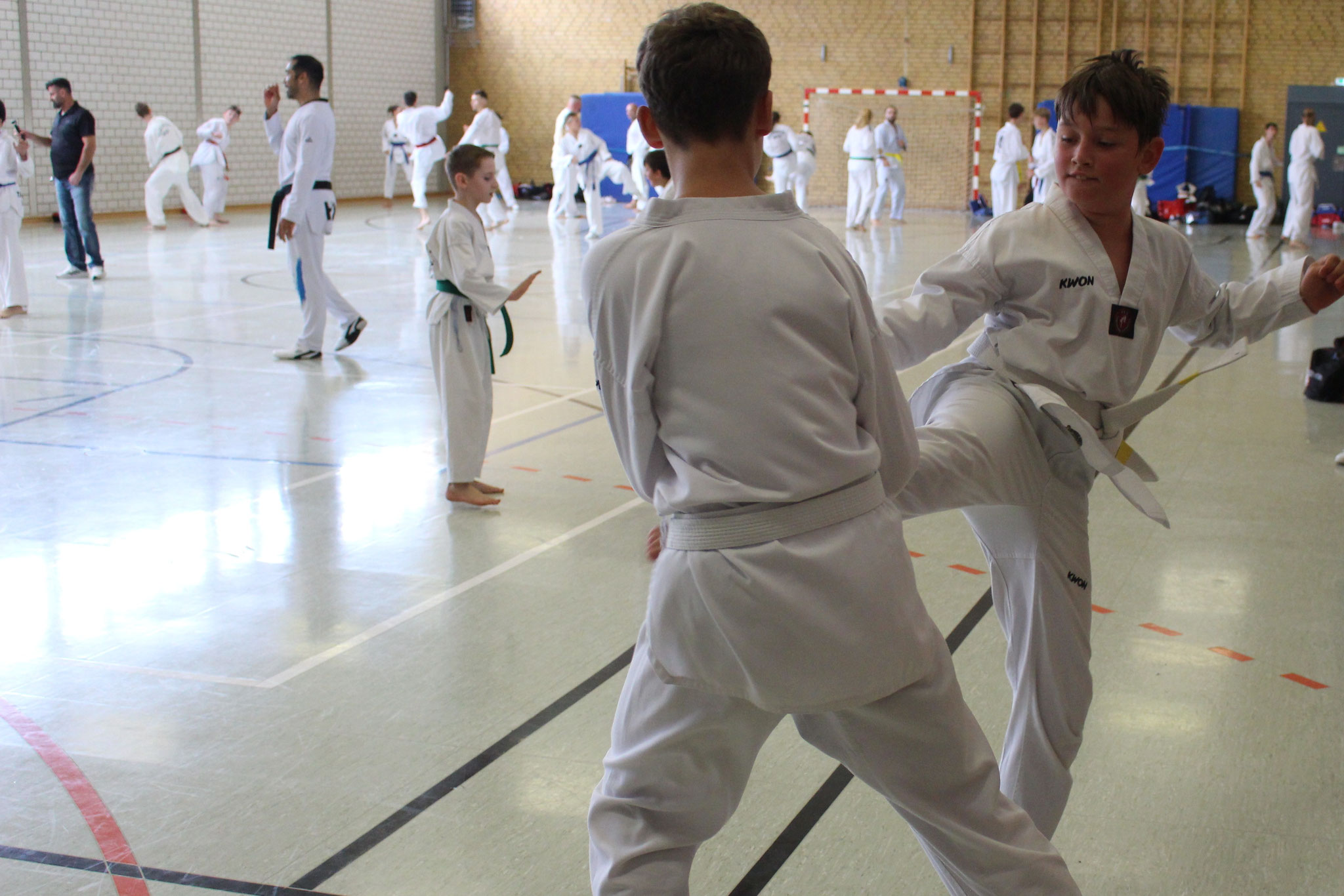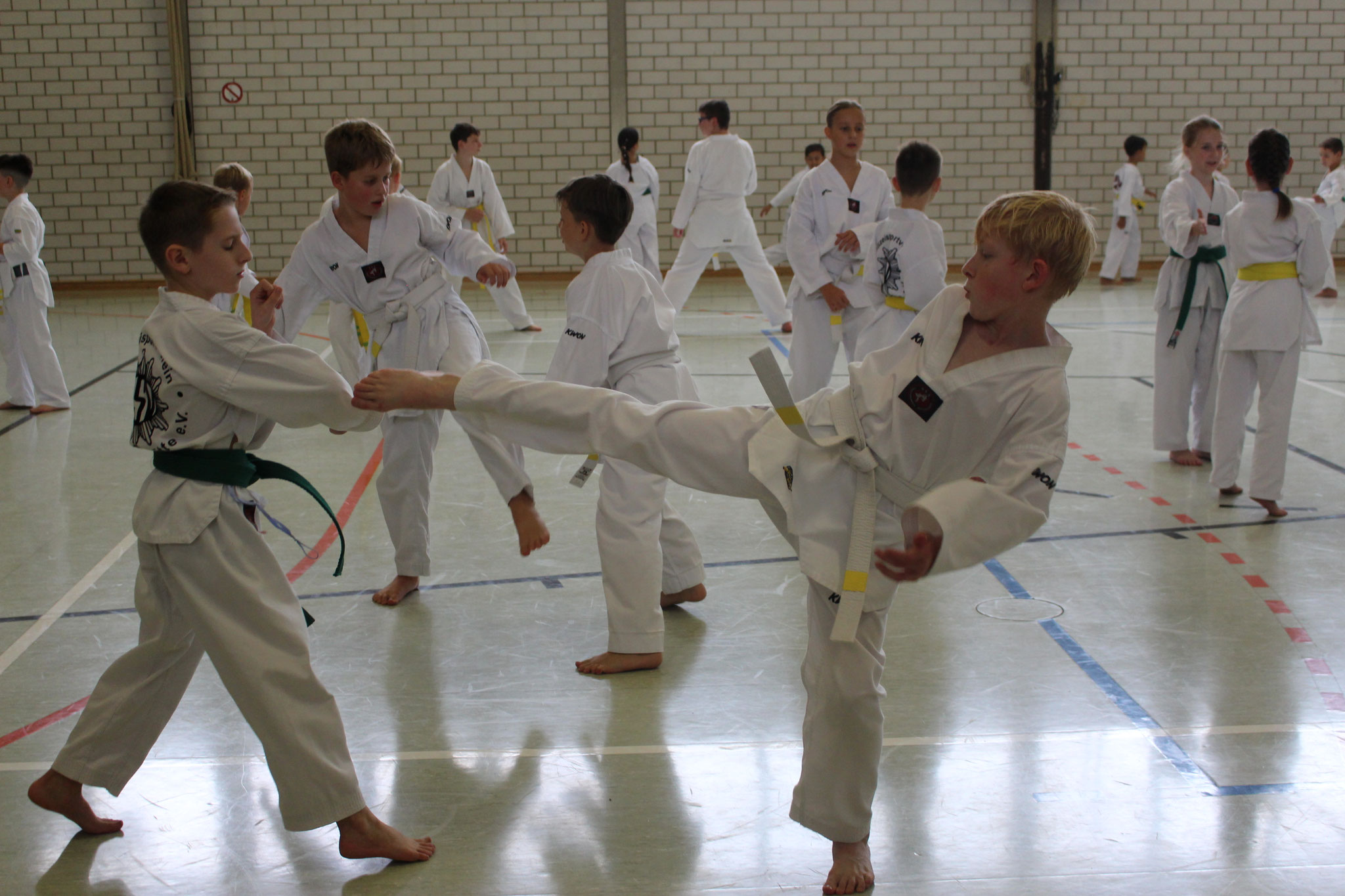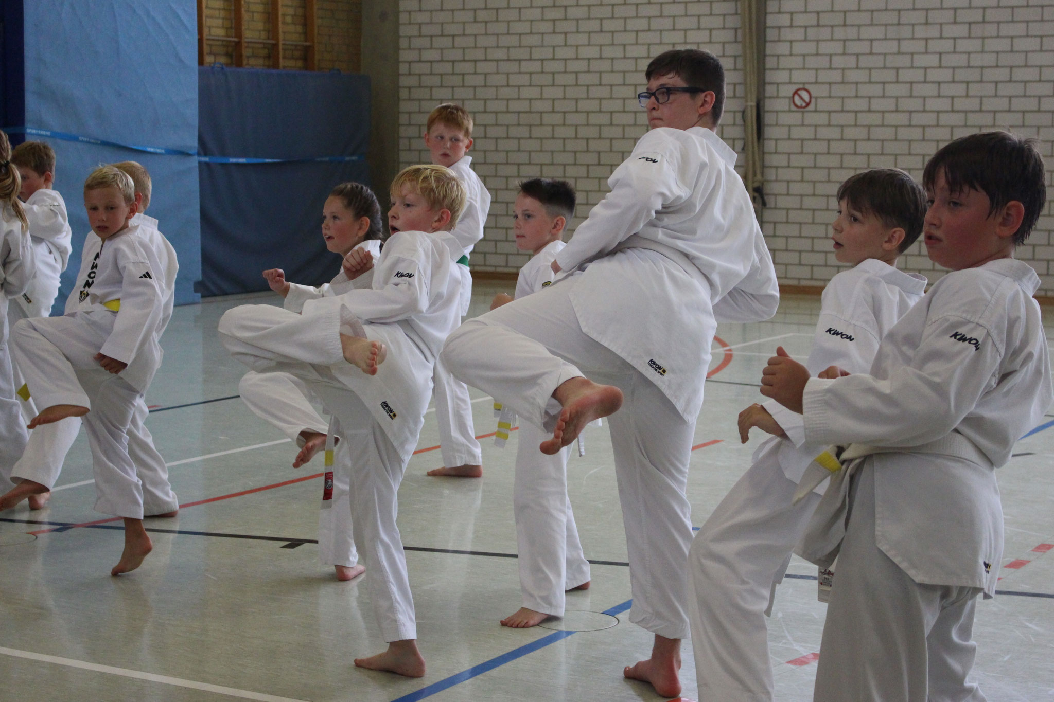 Zum Ende des Schuljahres war es dann auch für unsere vier Anfänger Matilda, Henri, Delian und Tamino soweit. Sie legten ihre erste Prüfung überhaupt, ebenfalls bei Prüfer Wolfgang Falke, jedoch auf heimischer Fläche in Arnum ab. Der kleine Turbokurs, der die Prüfungsinhalte von sonst neun Monaten in nur sechs Monaten erarbeitet hatte, konnte den Prüfern in allen Fächern (Grundtechnik, Pratzentechniken (Pratzen-Sparring), Step-Sparring, Kampf-Il-Bo-Taeryon und Theorie überzeugen. Natürlich gibt es wie immer noch Details zu bearbeiten, worauf Falke detailliert hinwies. Die beste Prüfungsleistung insgesamt lieferte Matilda ab, die sich trotz einer schmerzhaften Fußverletzung nichts anmerken ließ und eine fehlerfreie Bestleistung präsentierte. Theorie war von allen sehr gut gelernt, denn niemand blieb eine korrekte Antwort schuldig.