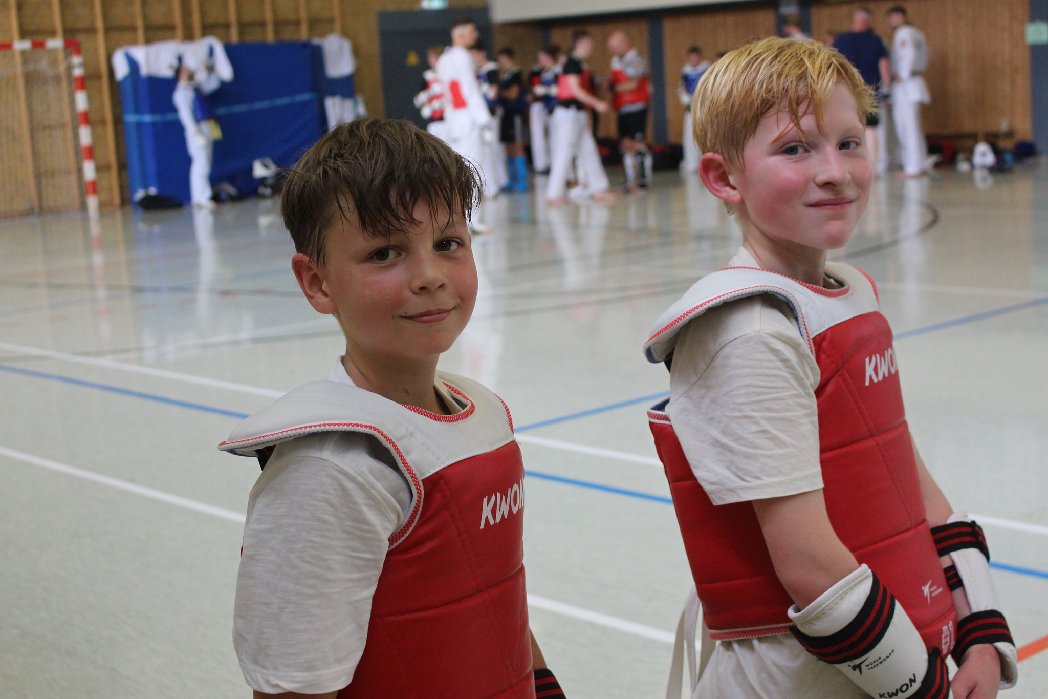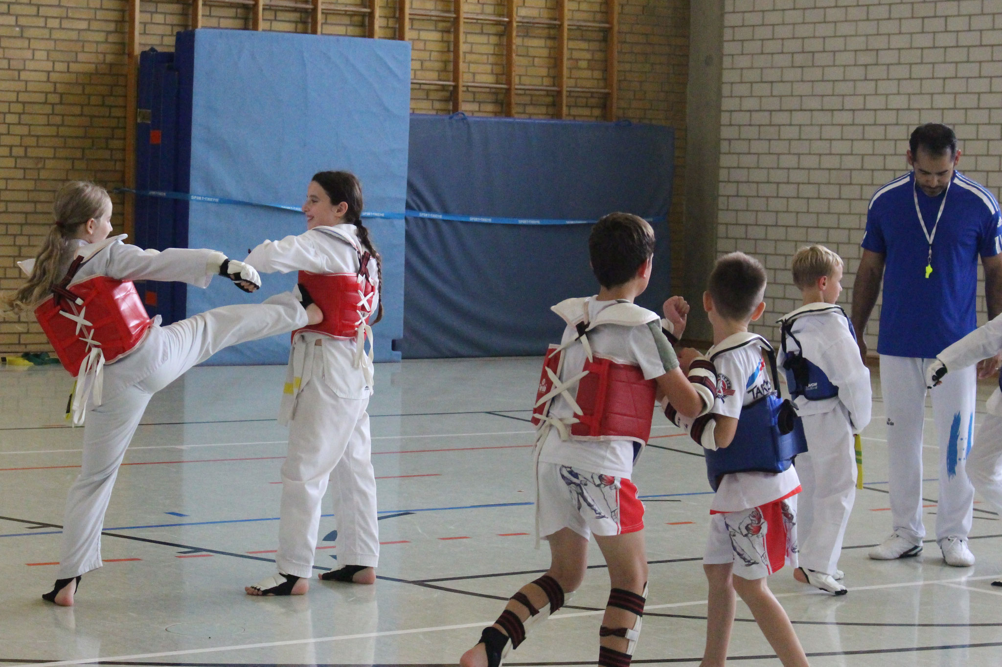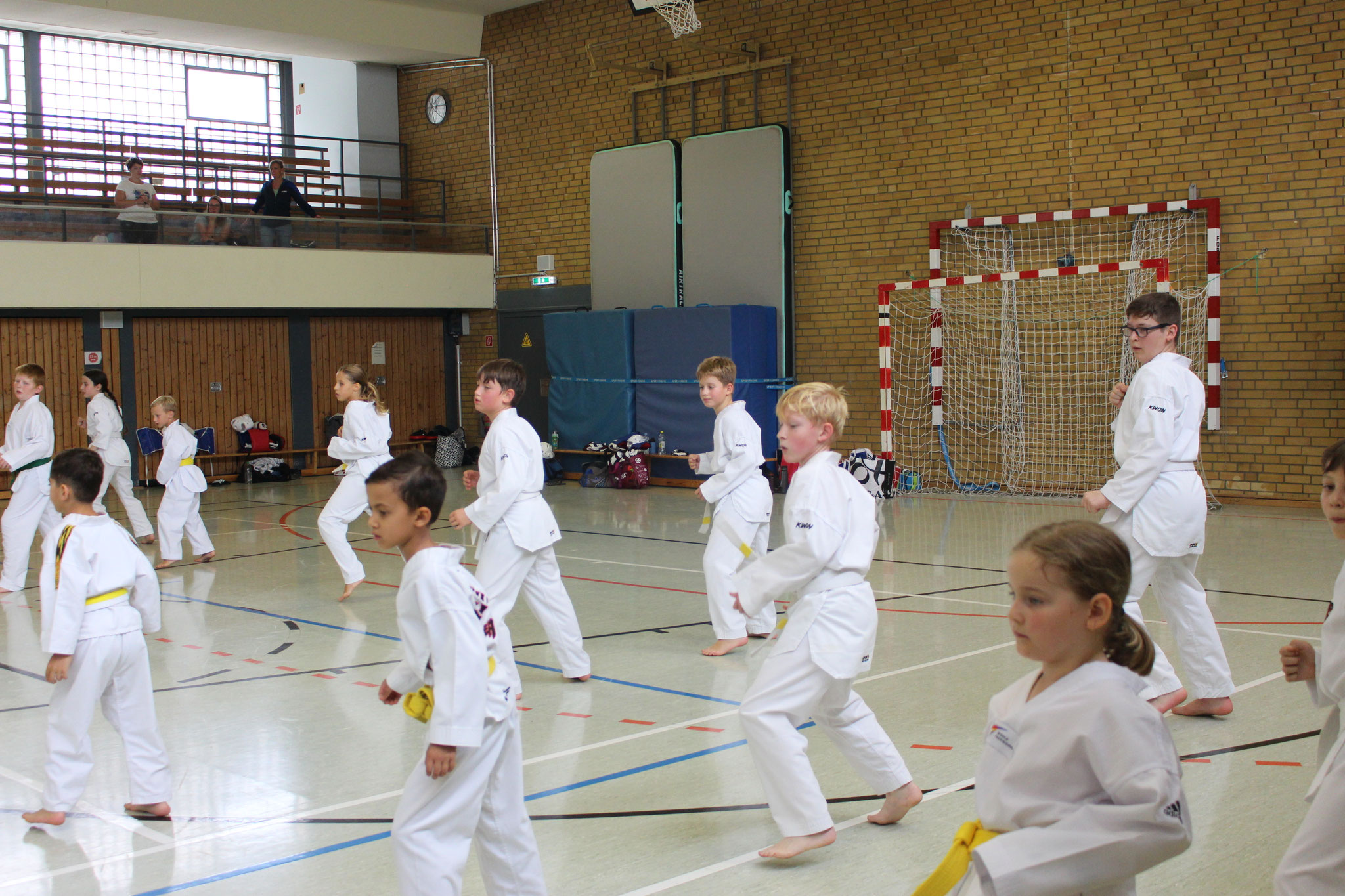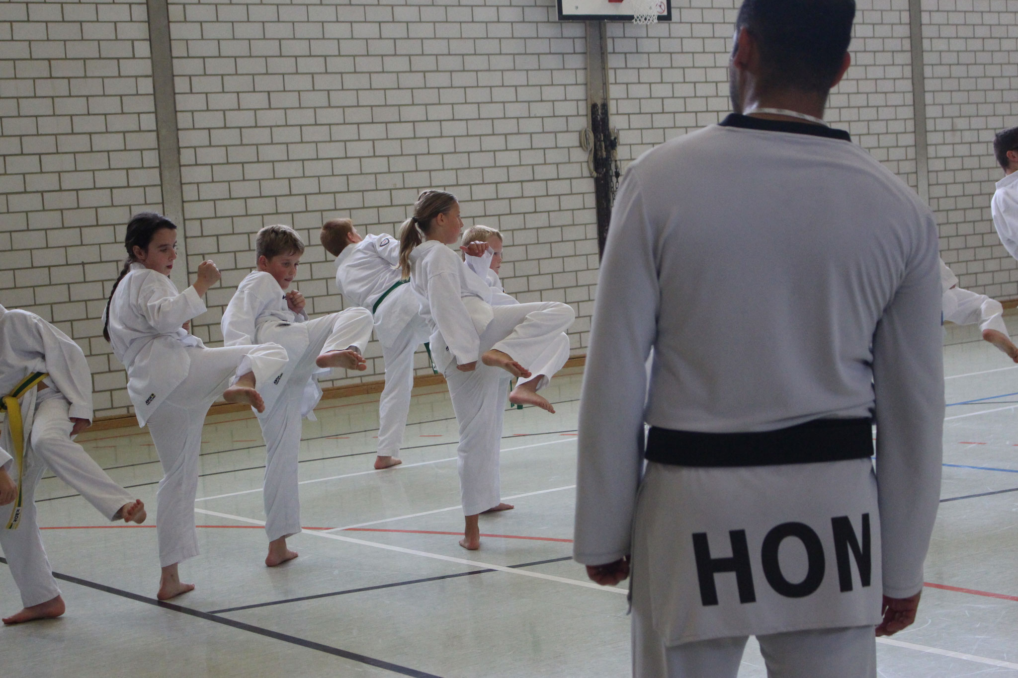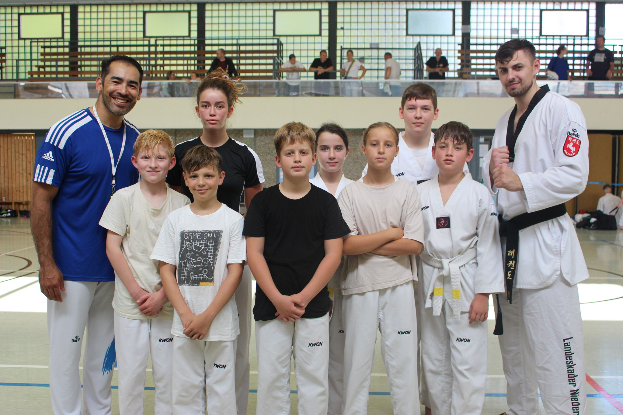 Zum Ende des Schuljahres war es dann auch für unsere vier Anfänger Matilda, Henri, Delian und Tamino soweit. Sie legten ihre erste Prüfung überhaupt, ebenfalls bei Prüfer Wolfgang Falke, jedoch auf heimischer Fläche in Arnum ab. Der kleine Turbokurs, der die Prüfungsinhalte von sonst neun Monaten in nur sechs Monaten erarbeitet hatte, konnte den Prüfern in allen Fächern (Grundtechnik, Pratzentechniken (Pratzen-Sparring), Step-Sparring, Kampf-Il-Bo-Taeryon und Theorie überzeugen. Natürlich gibt es wie immer noch Details zu bearbeiten, worauf Falke detailliert hinwies. Die beste Prüfungsleistung insgesamt lieferte Matilda ab, die sich trotz einer schmerzhaften Fußverletzung nichts anmerken ließ und eine fehlerfreie Bestleistung präsentierte. Theorie war von allen sehr gut gelernt, denn niemand blieb eine korrekte Antwort schuldig.