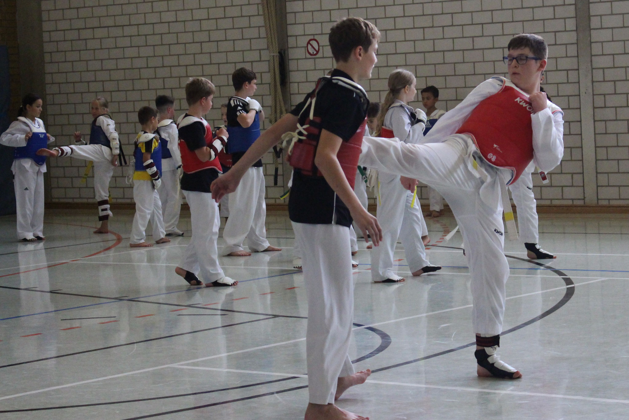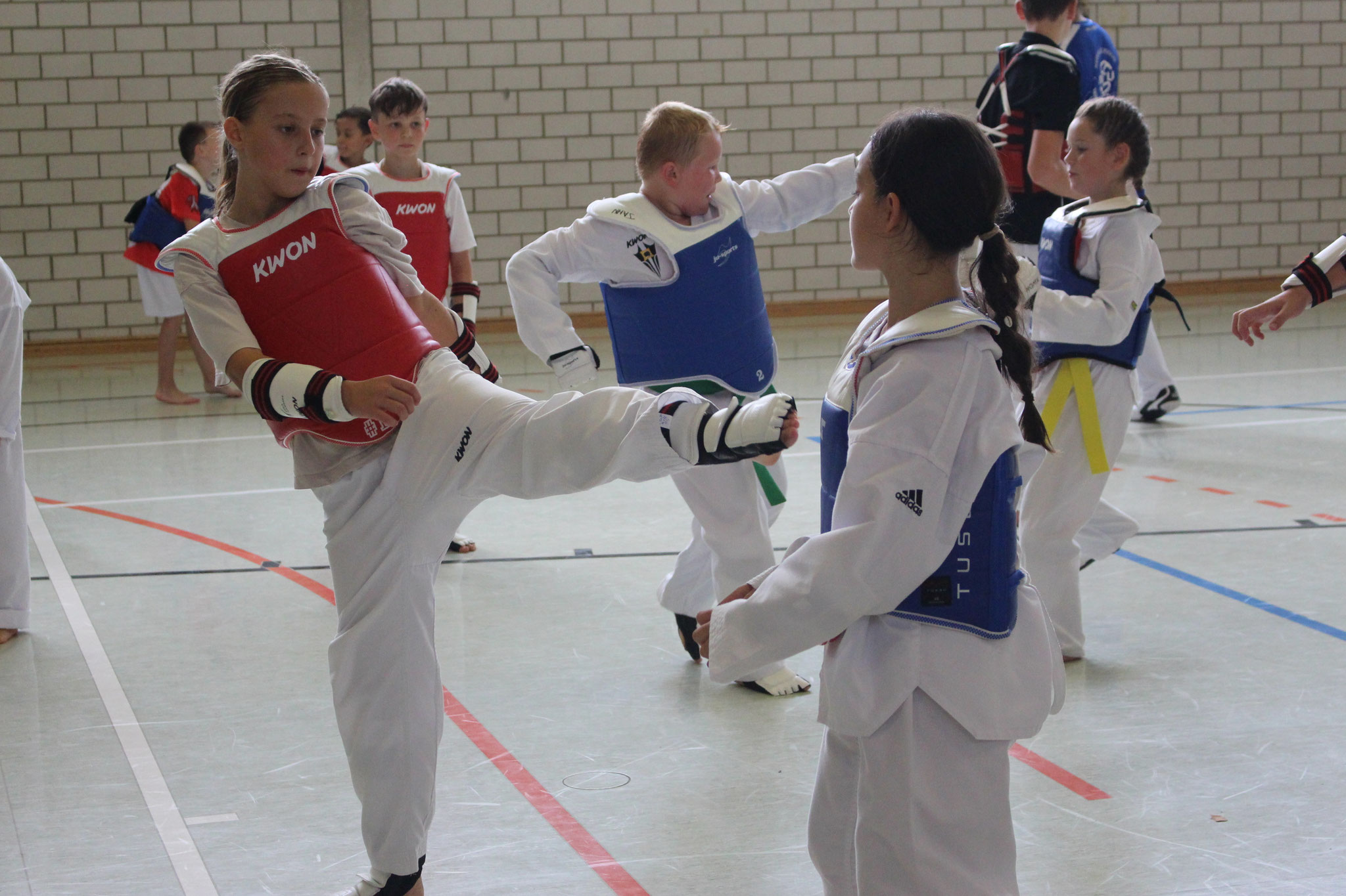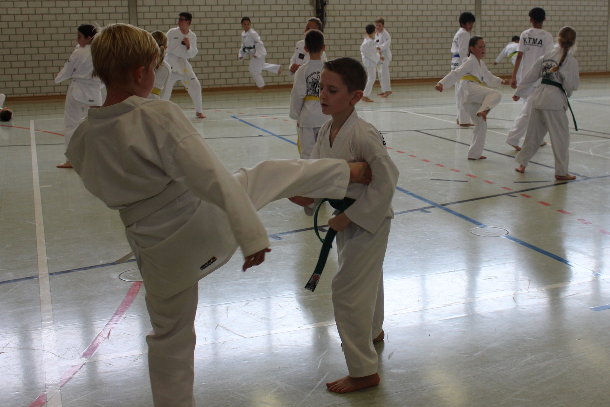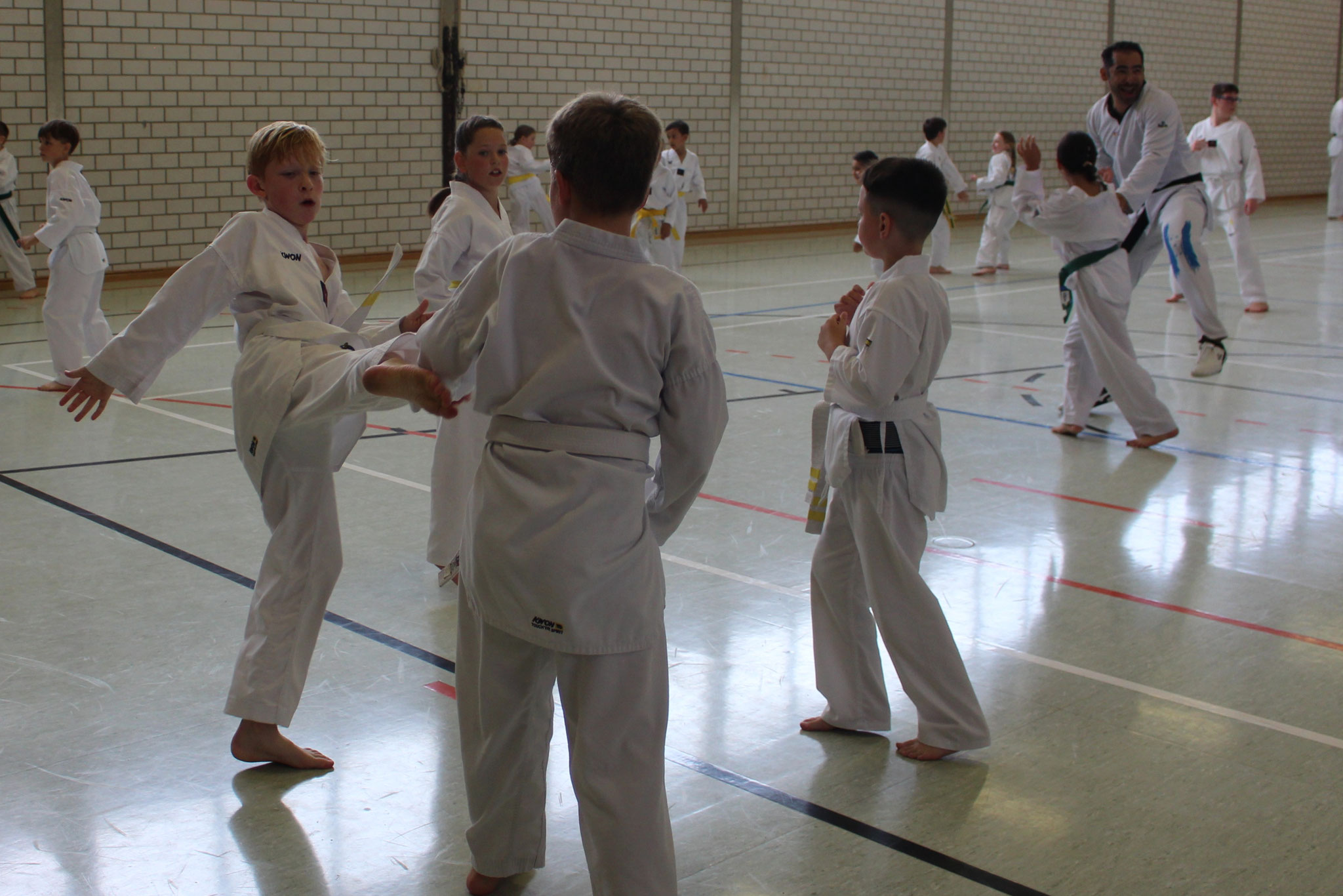 Zum Ende des Schuljahres war es dann auch für unsere vier Anfänger Matilda, Henri, Delian und Tamino soweit. Sie legten ihre erste Prüfung überhaupt, ebenfalls bei Prüfer Wolfgang Falke, jedoch auf heimischer Fläche in Arnum ab. Der kleine Turbokurs, der die Prüfungsinhalte von sonst neun Monaten in nur sechs Monaten erarbeitet hatte, konnte den Prüfern in allen Fächern (Grundtechnik, Pratzentechniken (Pratzen-Sparring), Step-Sparring, Kampf-Il-Bo-Taeryon und Theorie überzeugen. Natürlich gibt es wie immer noch Details zu bearbeiten, worauf Falke detailliert hinwies. Die beste Prüfungsleistung insgesamt lieferte Matilda ab, die sich trotz einer schmerzhaften Fußverletzung nichts anmerken ließ und eine fehlerfreie Bestleistung präsentierte. Theorie war von allen sehr gut gelernt, denn niemand blieb eine korrekte Antwort schuldig.