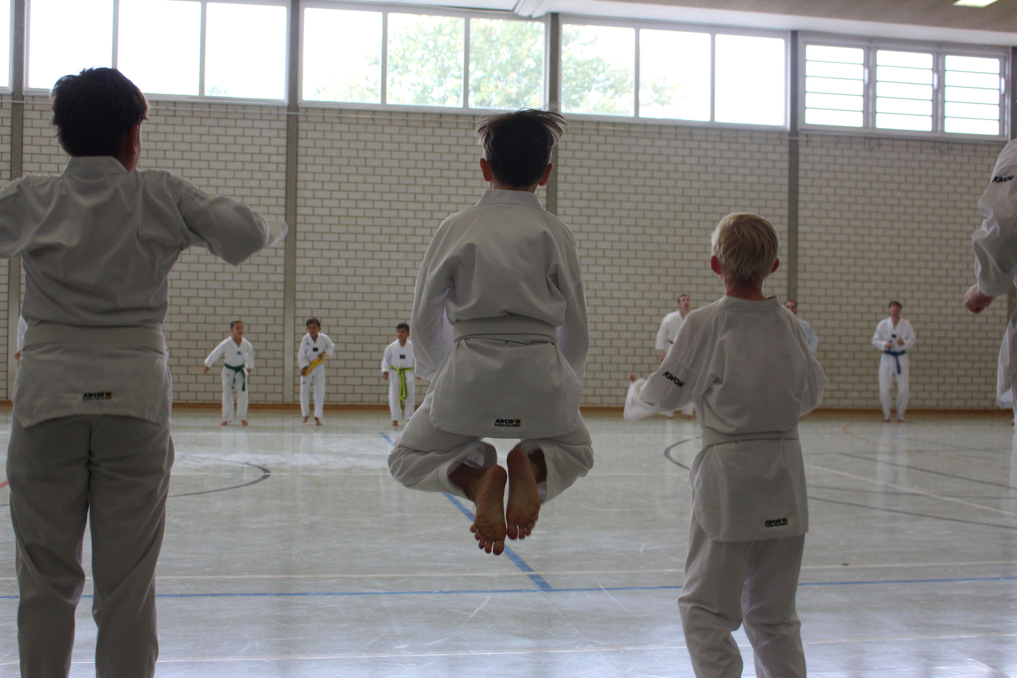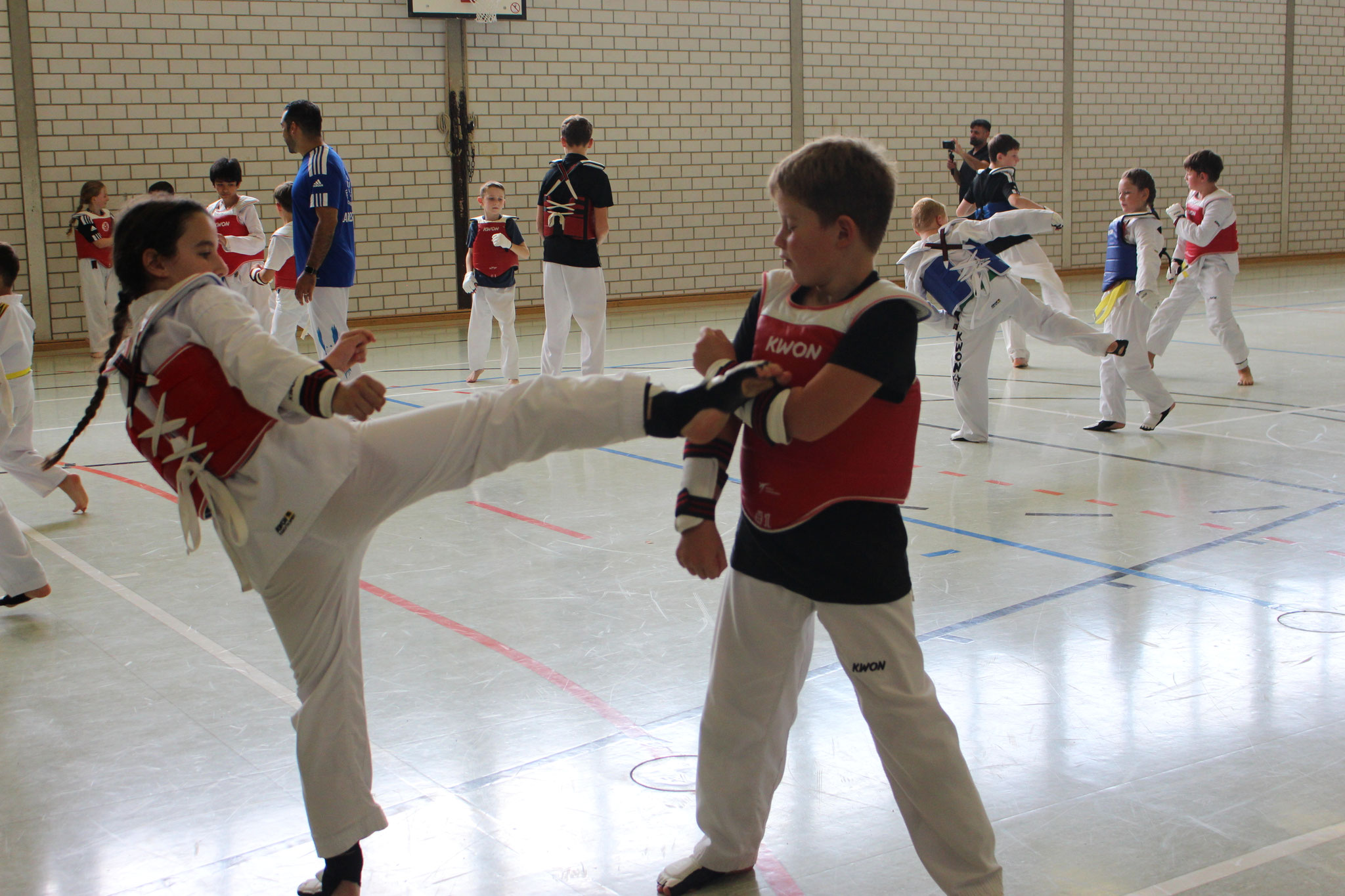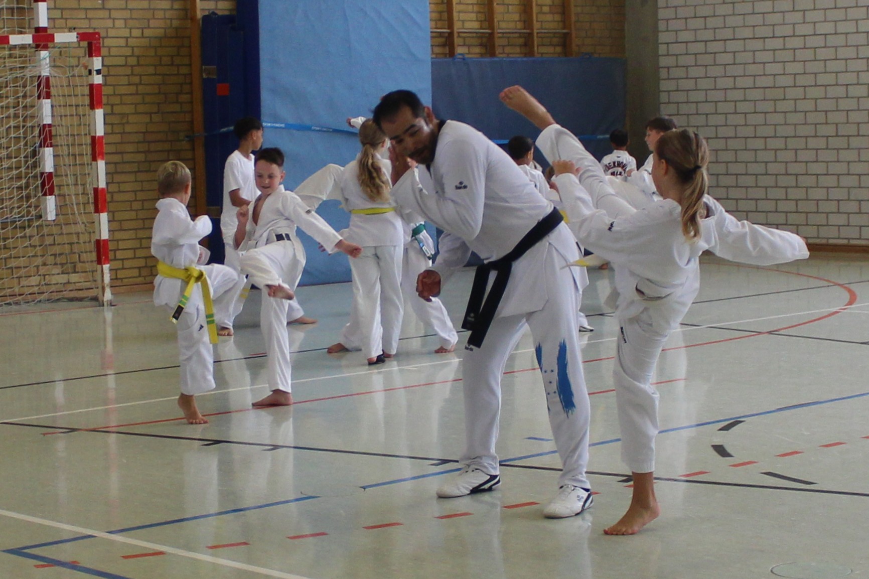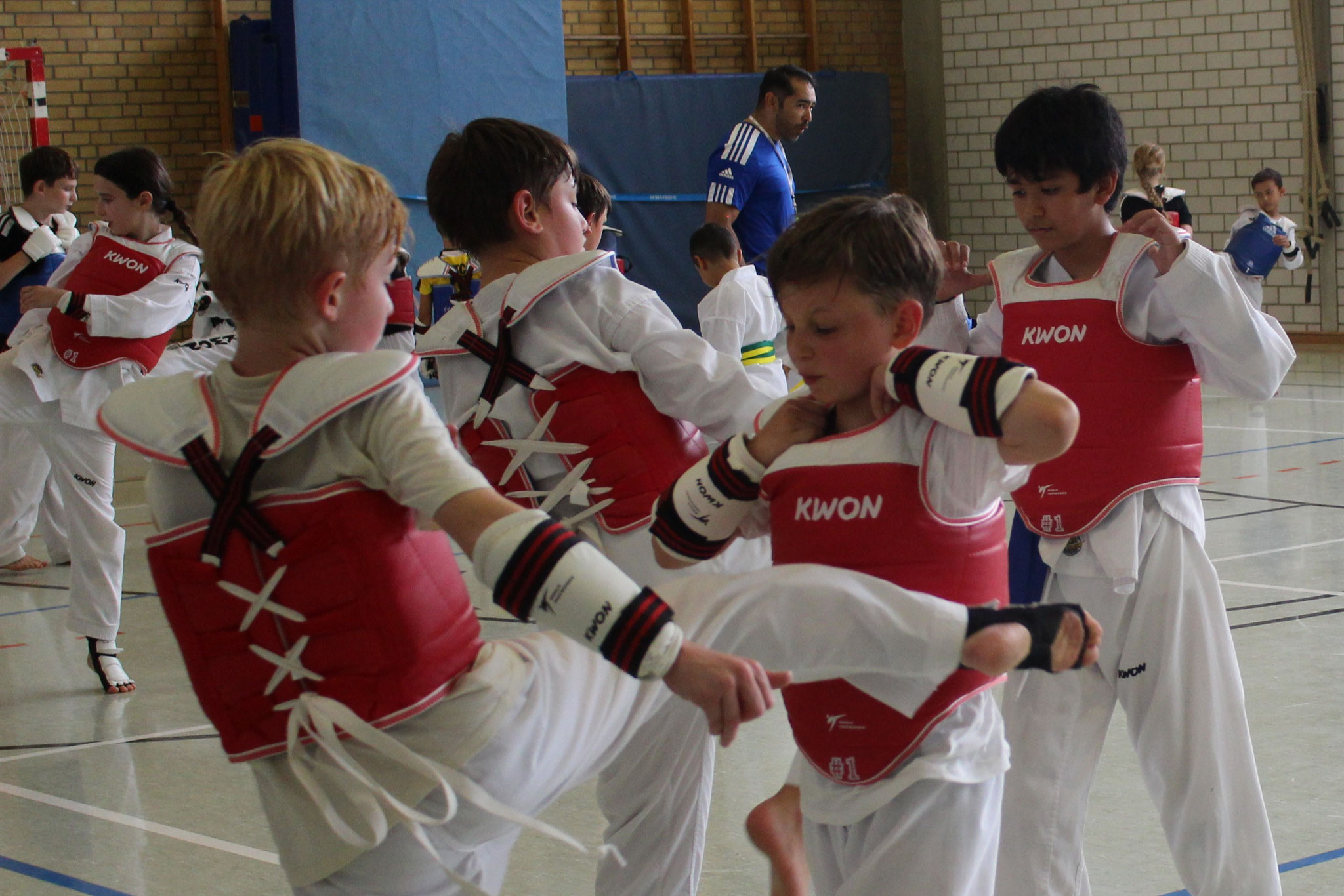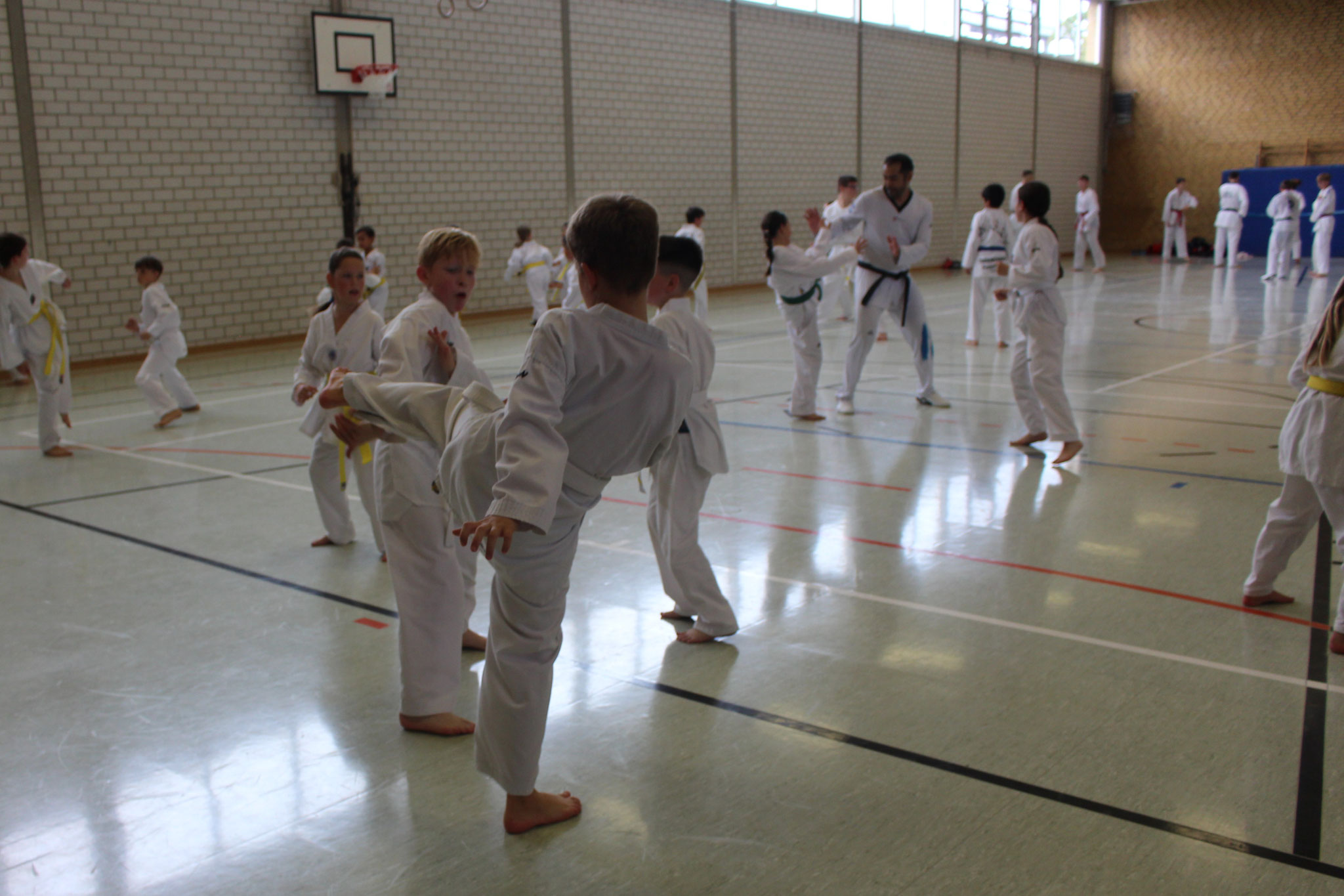 Zum Ende des Schuljahres war es dann auch für unsere vier Anfänger Matilda, Henri, Delian und Tamino soweit. Sie legten ihre erste Prüfung überhaupt, ebenfalls bei Prüfer Wolfgang Falke, jedoch auf heimischer Fläche in Arnum ab. Der kleine Turbokurs, der die Prüfungsinhalte von sonst neun Monaten in nur sechs Monaten erarbeitet hatte, konnte den Prüfern in allen Fächern (Grundtechnik, Pratzentechniken (Pratzen-Sparring), Step-Sparring, Kampf-Il-Bo-Taeryon und Theorie überzeugen. Natürlich gibt es wie immer noch Details zu bearbeiten, worauf Falke detailliert hinwies. Die beste Prüfungsleistung insgesamt lieferte Matilda ab, die sich trotz einer schmerzhaften Fußverletzung nichts anmerken ließ und eine fehlerfreie Bestleistung präsentierte. Theorie war von allen sehr gut gelernt, denn niemand blieb eine korrekte Antwort schuldig.