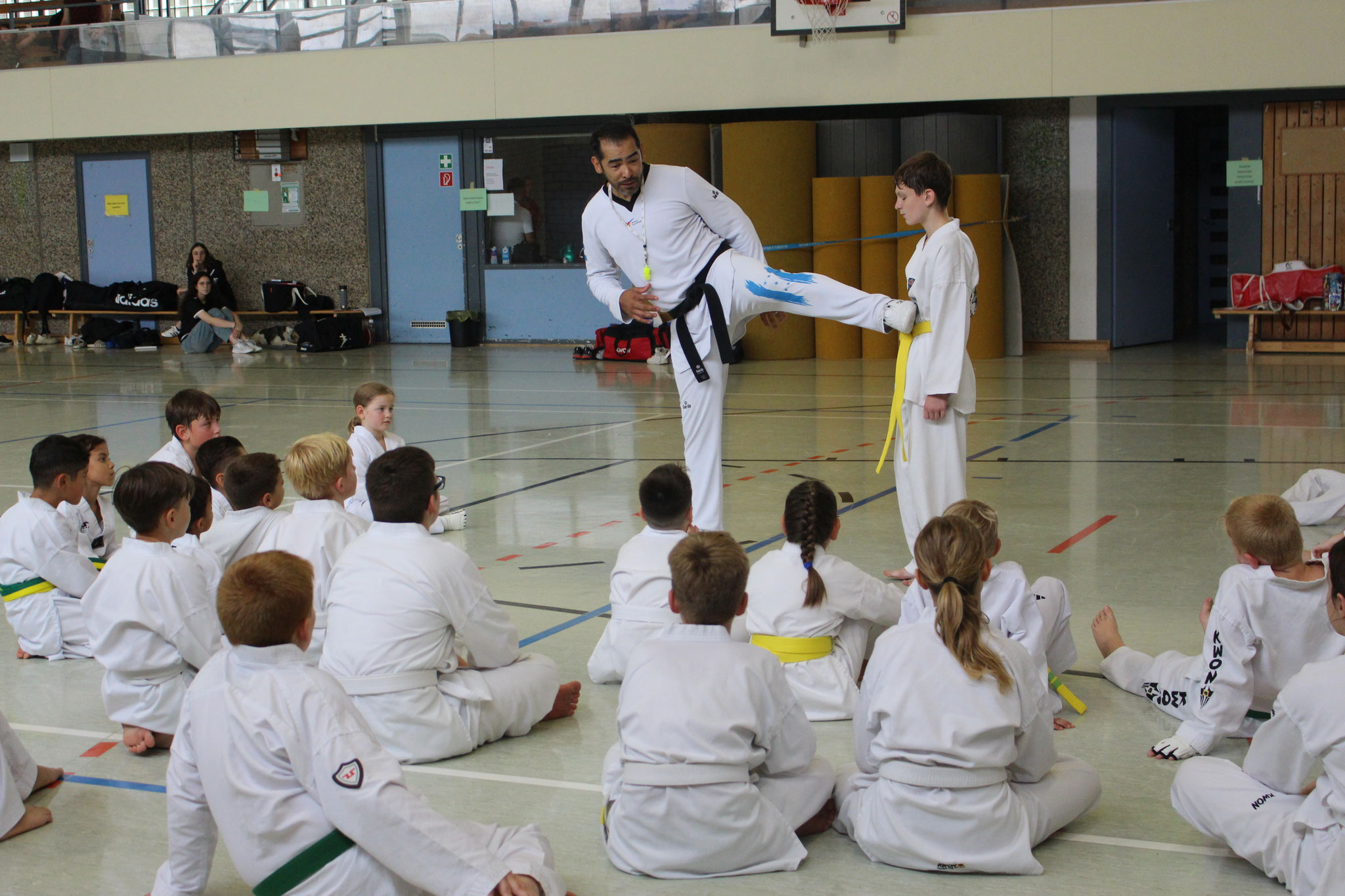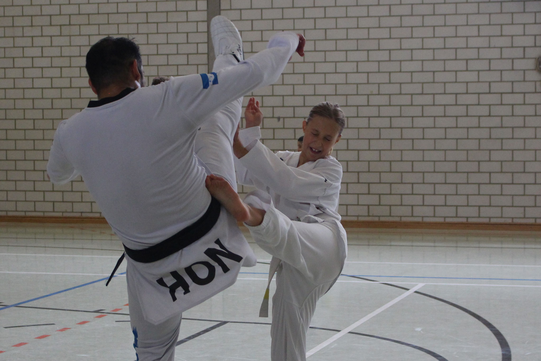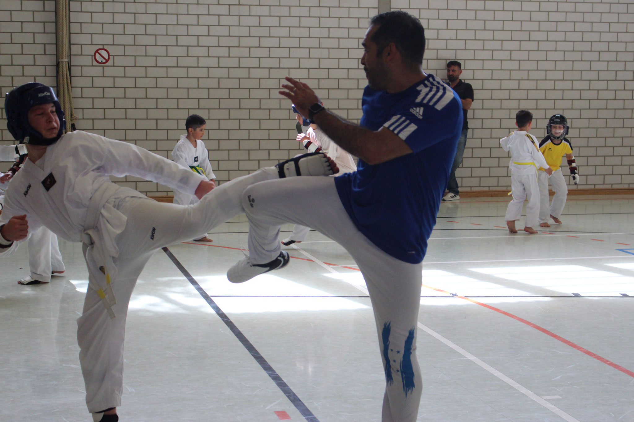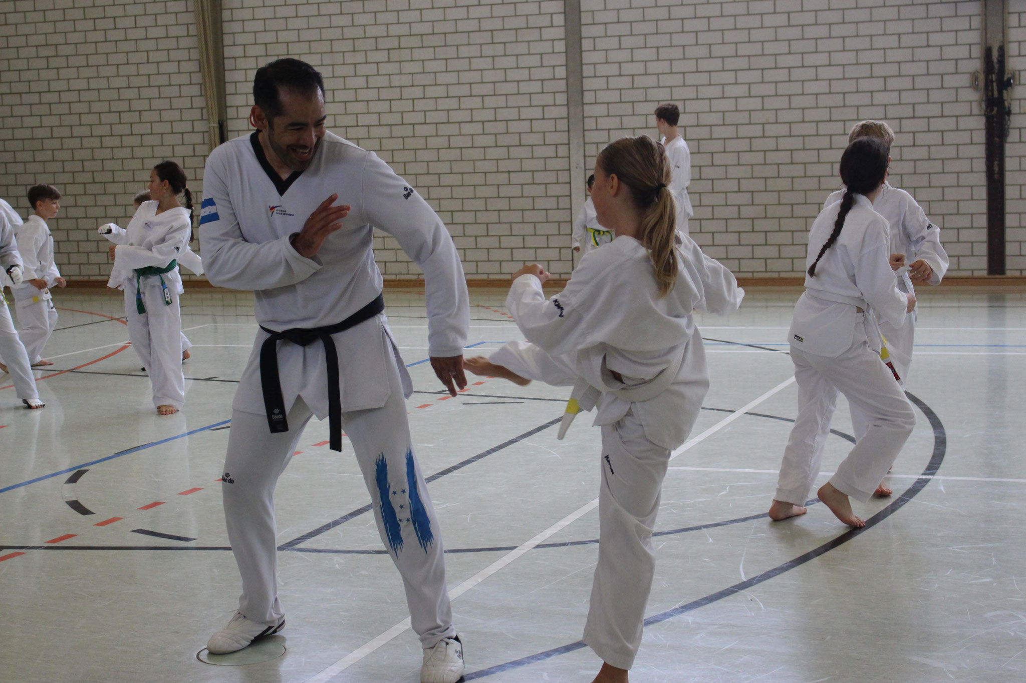 Für den jüngeren Nachwuchsbereich hatte NTU-Vizepräsident Vollkontakt Wolfgang Kiss den inzwischen in Deutschland lebenden zweifachen honduranischen Olympiateilnehmer Miguel Ferrera verpflichtet, der ein Feuerwerk an guter Laune und Motivation verbreitete und mit seiner ansteckenden Begeisterung für das Taekwondo einfach alle für die Übungen einnehmen konnte. Der sorgfältig durchdachte didaktische Aufbau der Hinführung zum Vollkontaktkampf, der alle anfänglich besonders relevanten Aspekte des Kampfes abwechslungsreich und altersgerecht entwickelte, gab auch unseren Sportlern und Sportlerinnen und dem Trainerteam viele neue Impulse. Mit dabei in dieser Gruppe waren unsere Sportler Henri, Levente, Lorenz, Tamino, Vasili, Laura und als Jüngste Sara, die alle bis zum Schluss durchhielten und trotz niedrigster Graduierung im Teilnehmerfeld problemlos mithalten konnten. Das Highlight für jeden war sicherlich das kurze Lehrsparring mit Miguel Ferrera selbst, der definitiv ein Händchen und ein großes Herz für die Nachwuchsarbeit hat.