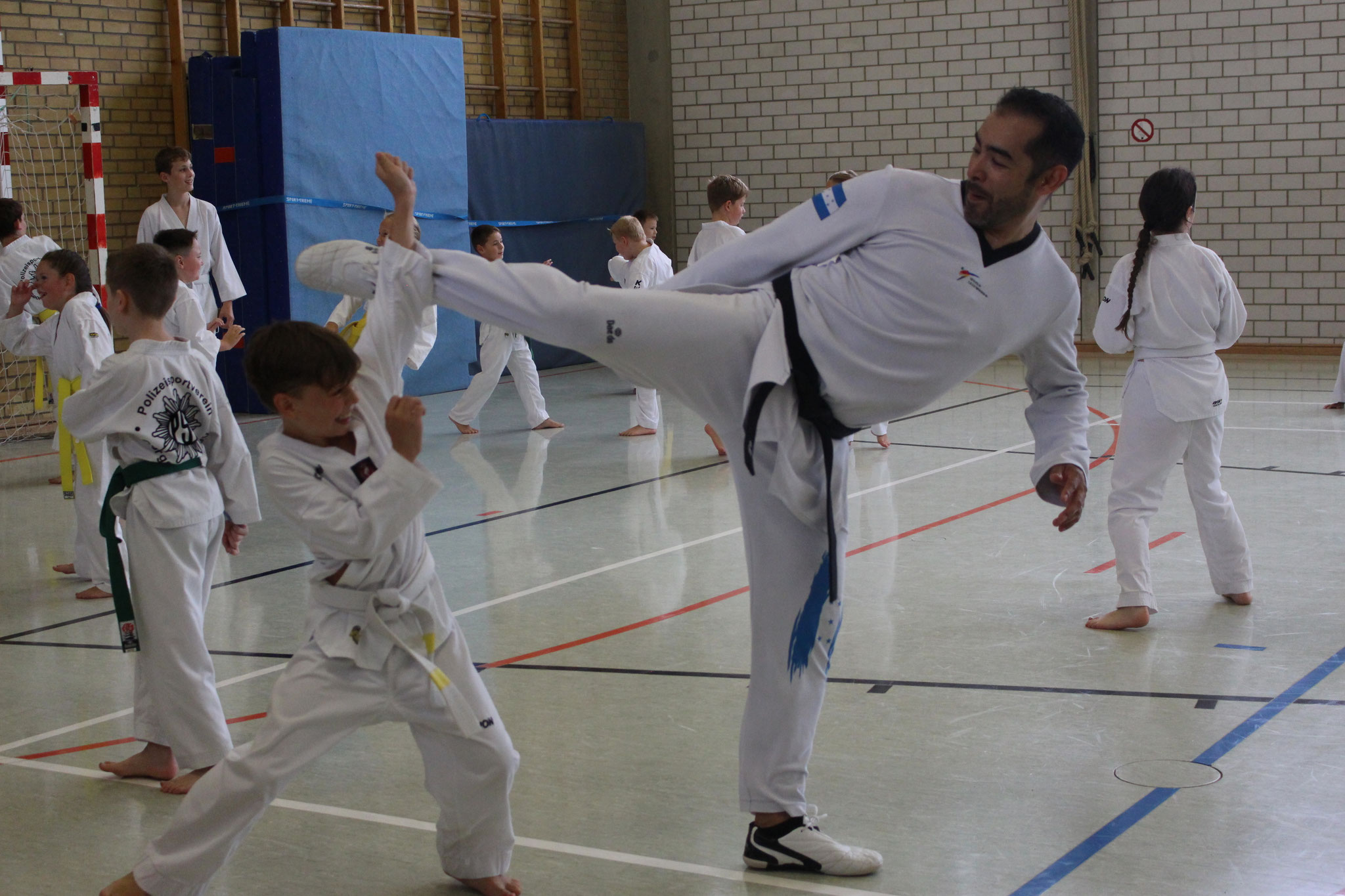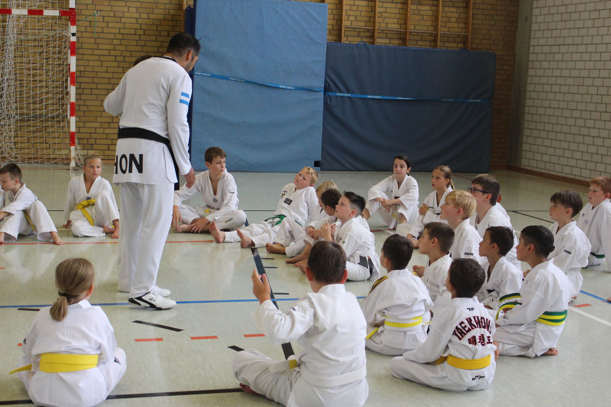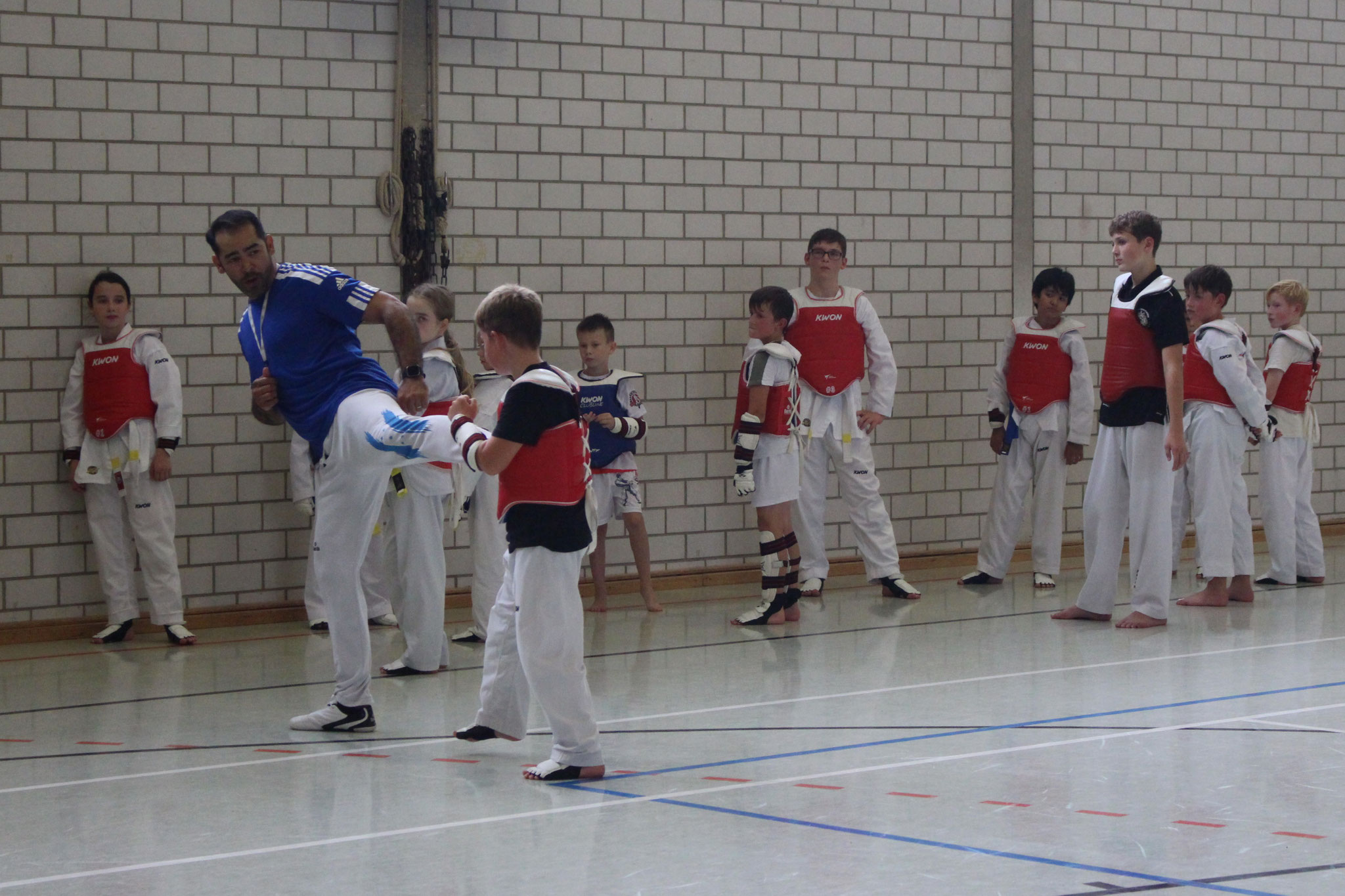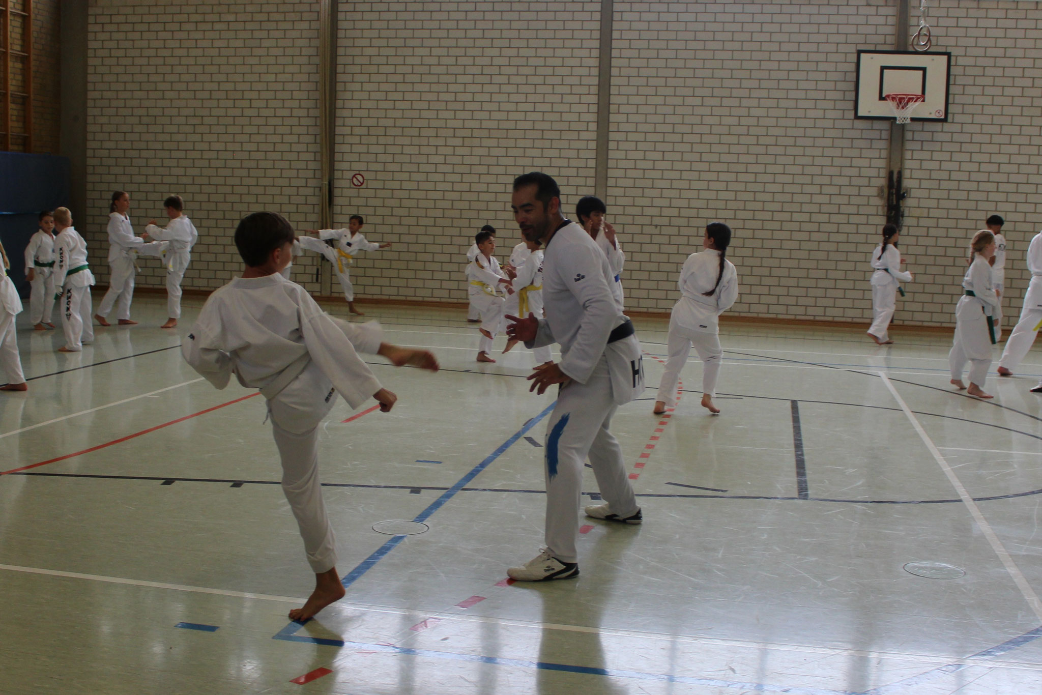 Für den jüngeren Nachwuchsbereich hatte NTU-Vizepräsident Vollkontakt Wolfgang Kiss den inzwischen in Deutschland lebenden zweifachen honduranischen Olympiateilnehmer Miguel Ferrera verpflichtet, der ein Feuerwerk an guter Laune und Motivation verbreitete und mit seiner ansteckenden Begeisterung für das Taekwondo einfach alle für die Übungen einnehmen konnte. Der sorgfältig durchdachte didaktische Aufbau der Hinführung zum Vollkontaktkampf, der alle anfänglich besonders relevanten Aspekte des Kampfes abwechslungsreich und altersgerecht entwickelte, gab auch unseren Sportlern und Sportlerinnen und dem Trainerteam viele neue Impulse. Mit dabei in dieser Gruppe waren unsere Sportler Henri, Levente, Lorenz, Tamino, Vasili, Laura und als Jüngste Sara, die alle bis zum Schluss durchhielten und trotz niedrigster Graduierung im Teilnehmerfeld problemlos mithalten konnten. Das Highlight für jeden war sicherlich das kurze Lehrsparring mit Miguel Ferrera selbst, der definitiv ein Händchen und ein großes Herz für die Nachwuchsarbeit hat.