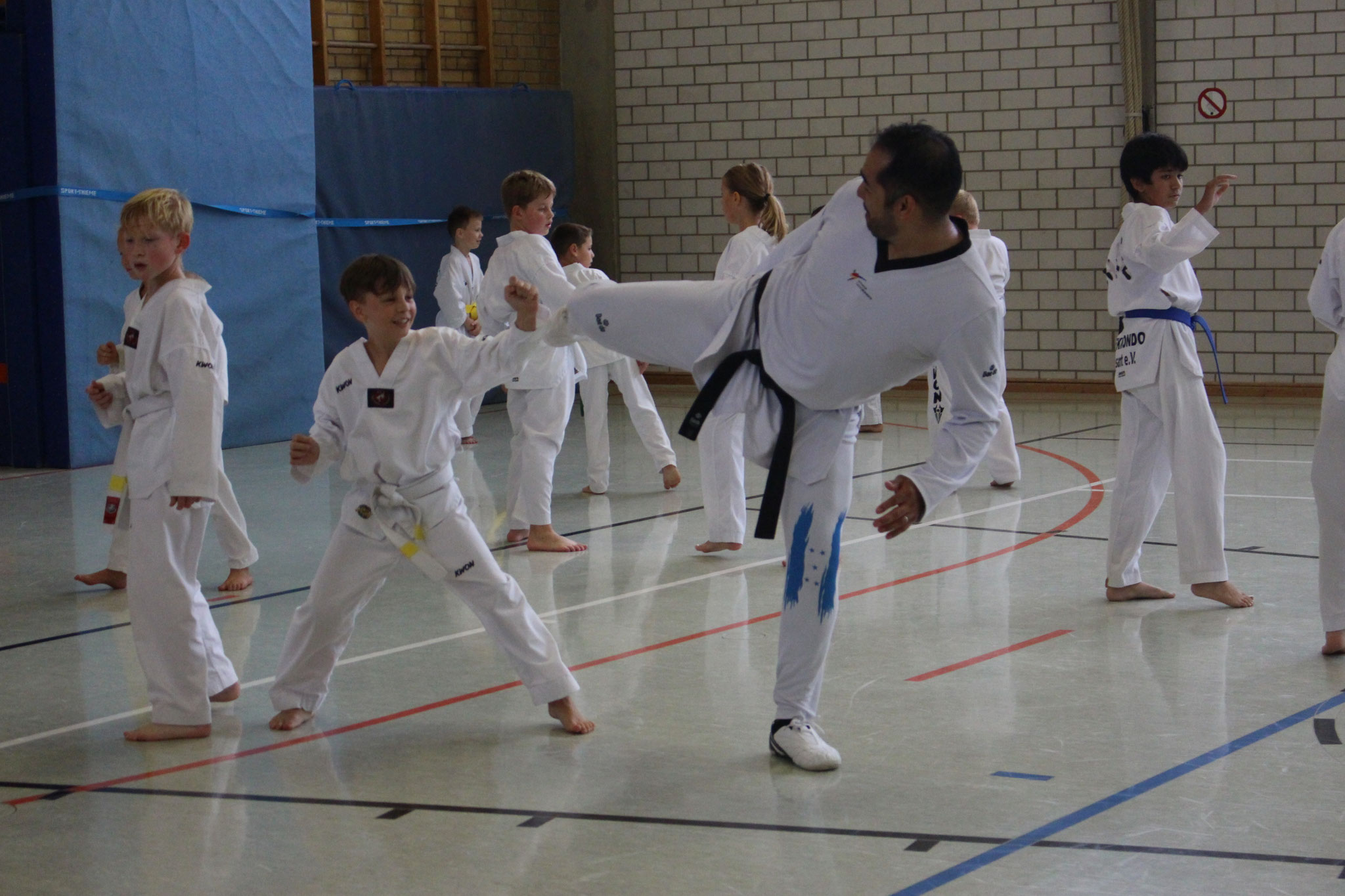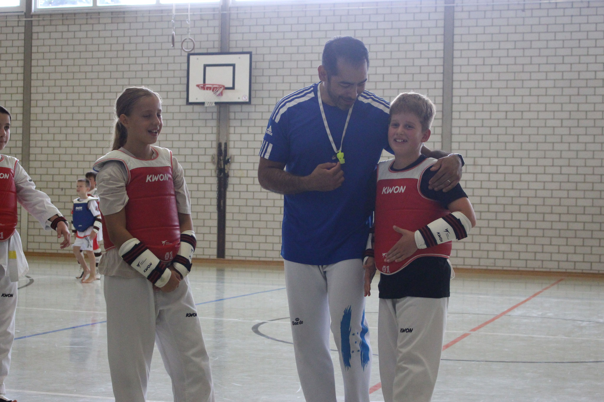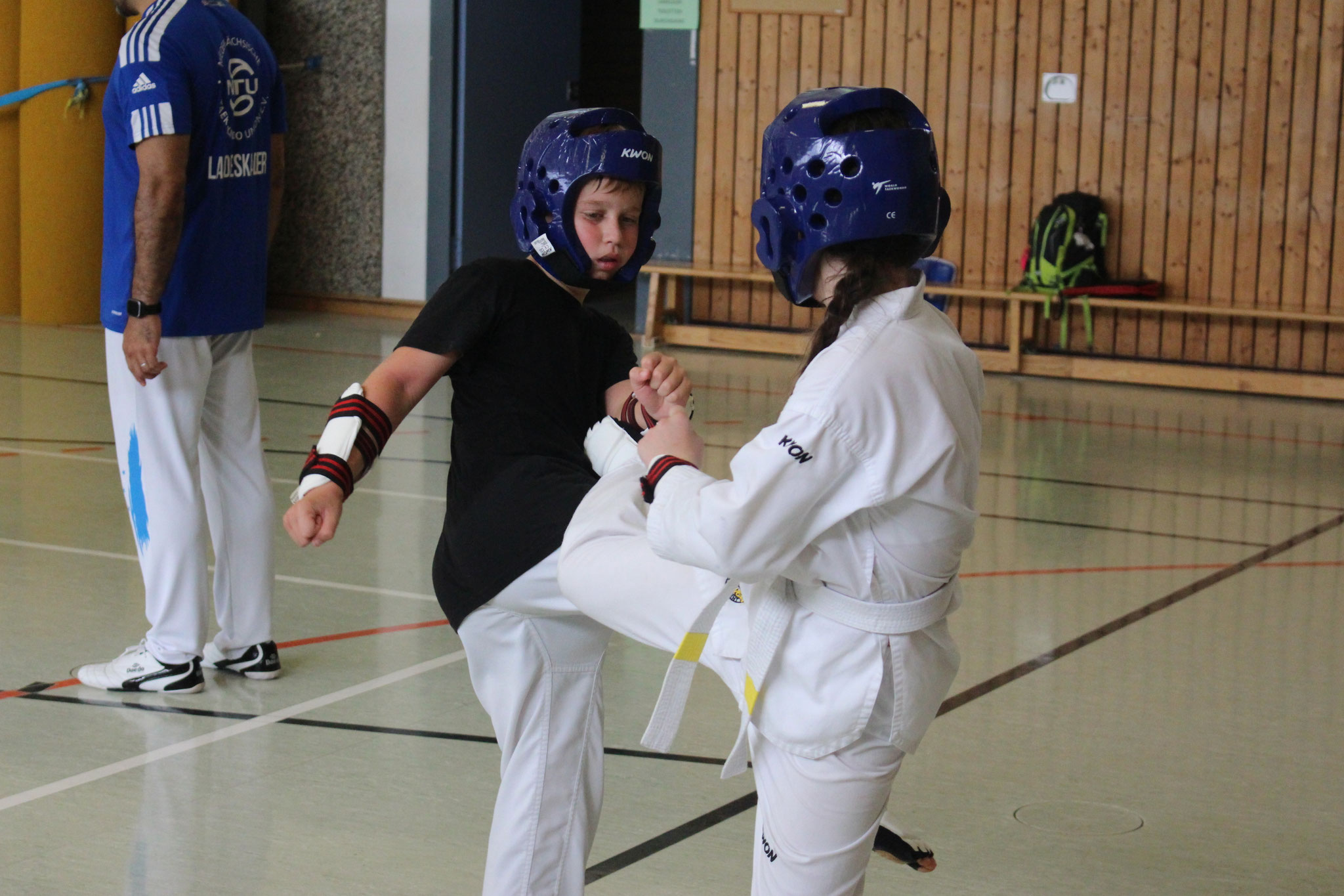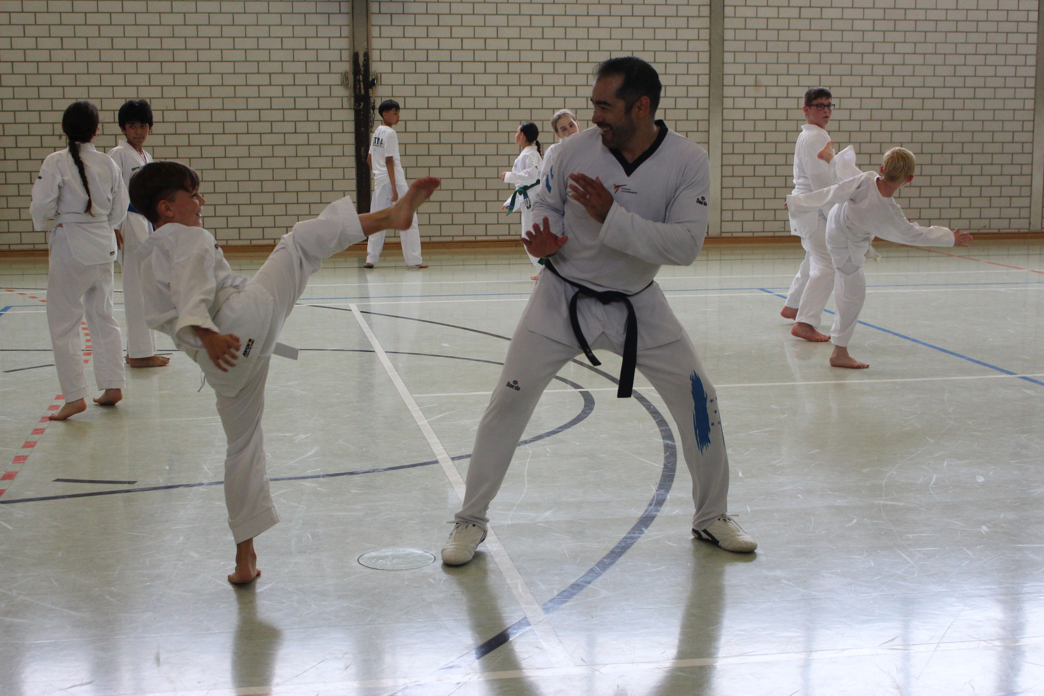 Für den jüngeren Nachwuchsbereich hatte NTU-Vizepräsident Vollkontakt Wolfgang Kiss den inzwischen in Deutschland lebenden zweifachen honduranischen Olympiateilnehmer Miguel Ferrera verpflichtet, der ein Feuerwerk an guter Laune und Motivation verbreitete und mit seiner ansteckenden Begeisterung für das Taekwondo einfach alle für die Übungen einnehmen konnte. Der sorgfältig durchdachte didaktische Aufbau der Hinführung zum Vollkontaktkampf, der alle anfänglich besonders relevanten Aspekte des Kampfes abwechslungsreich und altersgerecht entwickelte, gab auch unseren Sportlern und Sportlerinnen und dem Trainerteam viele neue Impulse. Mit dabei in dieser Gruppe waren unsere Sportler Henri, Levente, Lorenz, Tamino, Vasili, Laura und als Jüngste Sara, die alle bis zum Schluss durchhielten und trotz niedrigster Graduierung im Teilnehmerfeld problemlos mithalten konnten. Das Highlight für jeden war sicherlich das kurze Lehrsparring mit Miguel Ferrera selbst, der definitiv ein Händchen und ein großes Herz für die Nachwuchsarbeit hat.