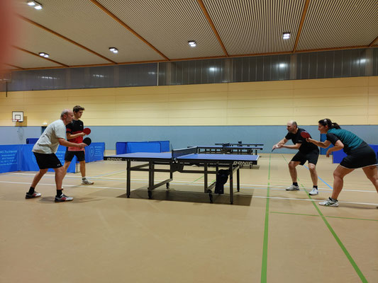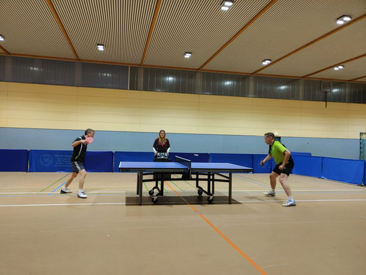Es wurden 4 Leistungsgruppen nach Bilanzwerten gebildet und Aktive der 1 Gruppe wurden mit Aktiven aus der 4 Gruppe zusammen gelost und entsprechend Gruppe 2 mit Gruppe 3. Somit entstanden recht homogene Doppelpaare, die dann in einer 6er und einer 7er Gruppe jeder gegen jeden spielten. Die Plätze 1 bis 4 jeder Gruppe bildeten das Viertelfinale. Nach teilweise spannenden Spielverläufen erspielten sich Felix Bär/ Heiko Rachner, Jennifer Batke/ Antonios Choudiakis, Chantelle Hill/ Nils Engelhardt und Patrick Müller/ Gordon Friebe den Einzug ins Halbfinale. Jeweils 3:1 endeten die Partien für Felix/ Heiko gegen Jenny/ Antonios und für Chantelle/ Nils gegen Patrick/ Gordon.