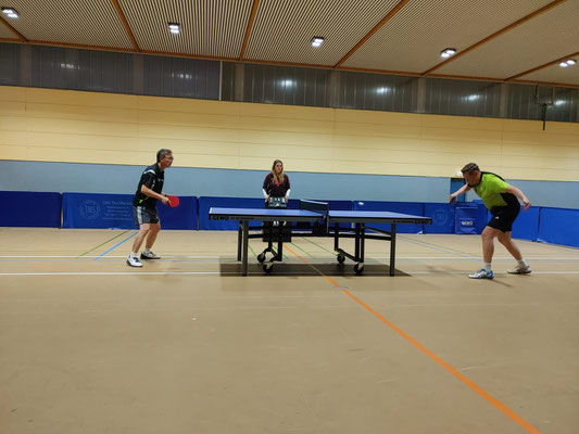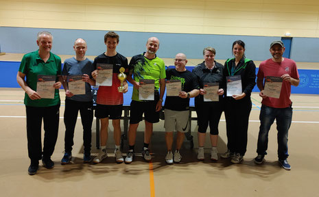 Bis zum 5ten Satz war das Endspiel zwischen Felix/ Heiko gegen Chantelle/ Nils sehr spannend und ausgeglichen. Im 5ten Satz konnten sich Felix/Heiko leicht absetzen und sicherten sich den Doppelmeistertitel 2025. Chantelle/Nils belegten den zweiten Platz. Der lange Spieltag mit den Siegern und Platzierten wurde gebührend mit ein paar kühlen Getränken feierlich abgeschlossen.